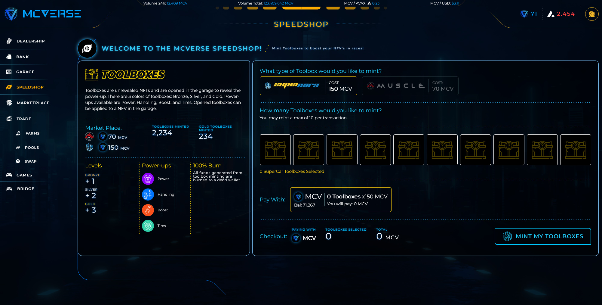 You will need at least ONE NFT from one of our collections and $MCV tokens. Currently, there are only two NFT collections to choose from; Super Cars or Muscle Cars, and each collection has 10k,  but not all are available. The first collection of Super Cars is entirely minted, and the only way to obtain one for your garage is from an NFT marketplace. Muscle Cars can be purchased from an NFT marketplace or minted for 1 AVAX each.\